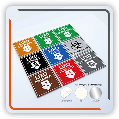 Garanta a sinalização correta dos coletores de resíduos com placas específicas para cada tipo de lixo. Organização visual que educa e promove a sustentabilidade.